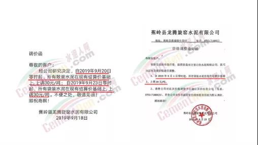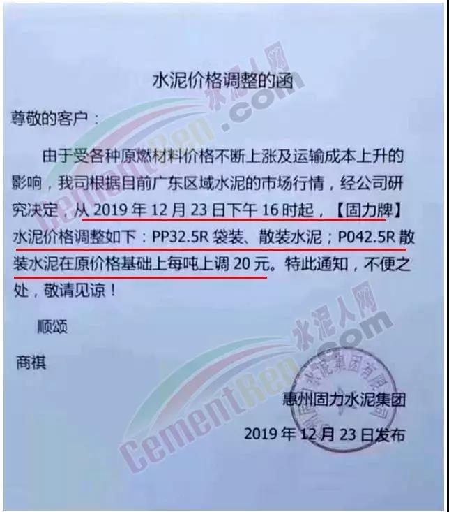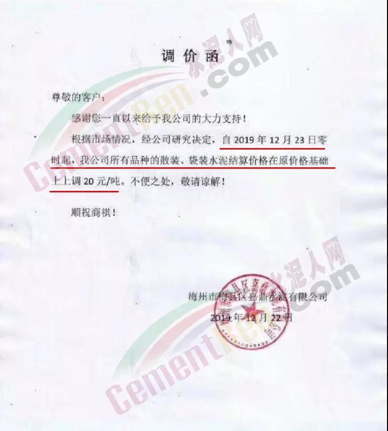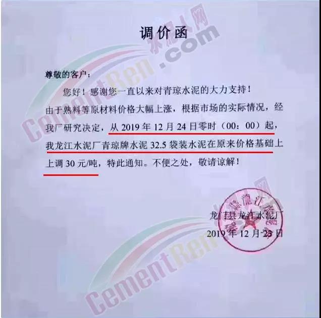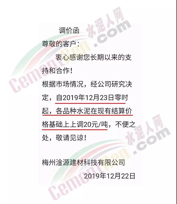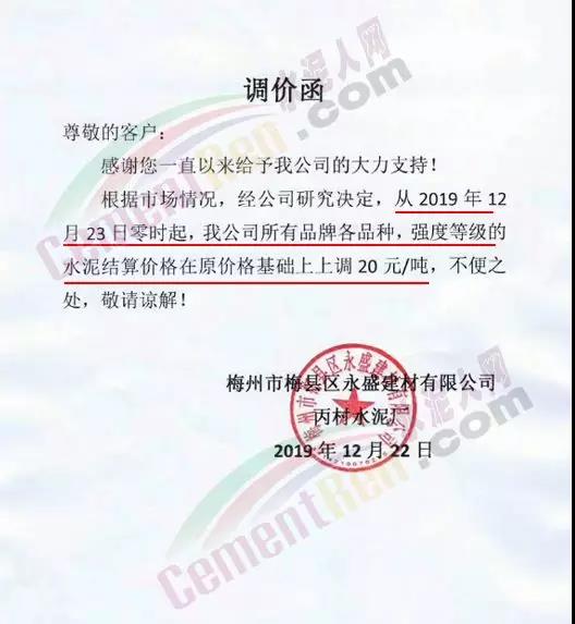 漲價(jià)通知尊敬的客戶,由于環(huán)保管控及近期原材料價(jià)格不斷上漲, 結(jié)合我公司的實(shí)際情況,經(jīng)公司領(lǐng)導(dǎo)研究決定:自2019年12月19日下午5點(diǎn)起,公司PF 32.5級(jí)水泥執(zhí)行價(jià)格在原價(jià)基礎(chǔ)上上調(diào)20元/噸,望廣大客戶諒解和支持!(****水泥有限公司2019年12月19日)