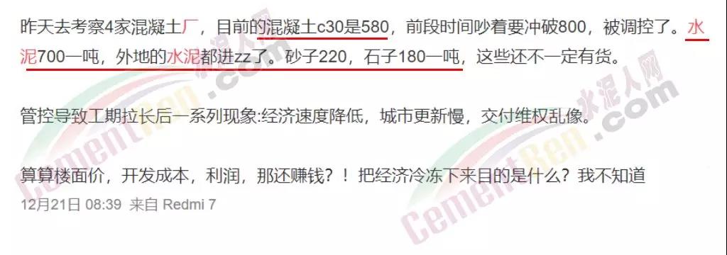 不久前,鄭州某施工企業(yè)向水泥人網(wǎng)反映,考察了四家混凝土廠,C30混凝土的最低價(jià)是580元,前段時(shí)間吵著要沖破800,被調(diào)控了。水泥價(jià)格沖高760元/噸,貴州、四川、內(nèi)蒙、山西、陜西多個(gè)省自治區(qū)的水泥都進(jìn)鄭州了。目前,砂子220元,石子180元,這些價(jià)高還不一定有貨。重污染天氣管控工地停工,工期拉長(zhǎng),部分項(xiàng)目出現(xiàn)了交付維權(quán)現(xiàn)象。算算樓面價(jià)、開(kāi)發(fā)成本、利潤(rùn),承包商大喊不賺錢(qián)。