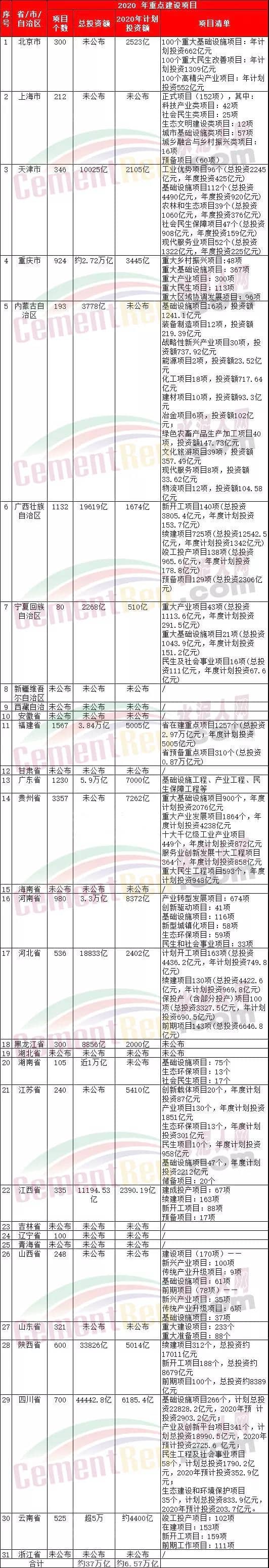 近日全國31個(gè)省、市、自治區(qū)發(fā)布了2020年計(jì)劃完成投資額規(guī)模達(dá)66958億元,其中,新基建預(yù)計(jì)投資額達(dá)15631億元,約占2020年投資額的23%。相關(guān)分析人士預(yù)計(jì)新基建7大領(lǐng)域合計(jì)投資規(guī)模在2020年能夠達(dá)到2萬億-2.45萬億。其中納入基建部分,拉動基建增速1.1%-2.6%。而根據(jù)各省市公布的未來幾年實(shí)施的新基建,高達(dá)37萬億。2020年各省市自治區(qū)重點(diǎn)建設(shè)項(xiàng)目如下:
