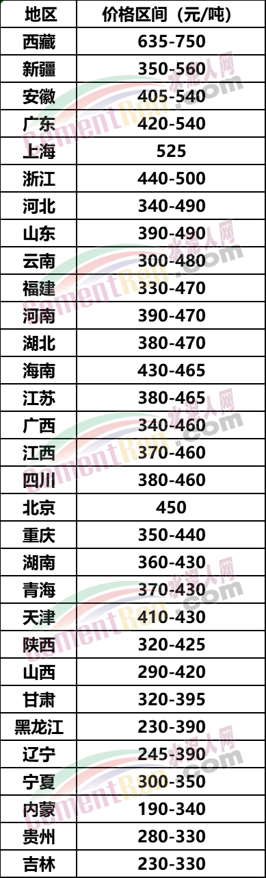 全國32個(gè)省市PO42.5散裝水泥價(jià)格一覽