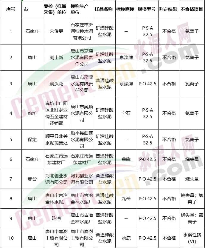 河北省河北省市場(chǎng)監(jiān)督管理局發(fā)布通報(bào)稱(chēng),抽查水泥、建筑防水卷材等21類(lèi)產(chǎn)品共檢出不合格樣品188批次,不合格樣品檢出率為8.6%,其中水泥產(chǎn)品10個(gè)批次不合格,不合格項(xiàng)目涉及氯離子、燒失量以及水溶性鉻(Ⅵ)。