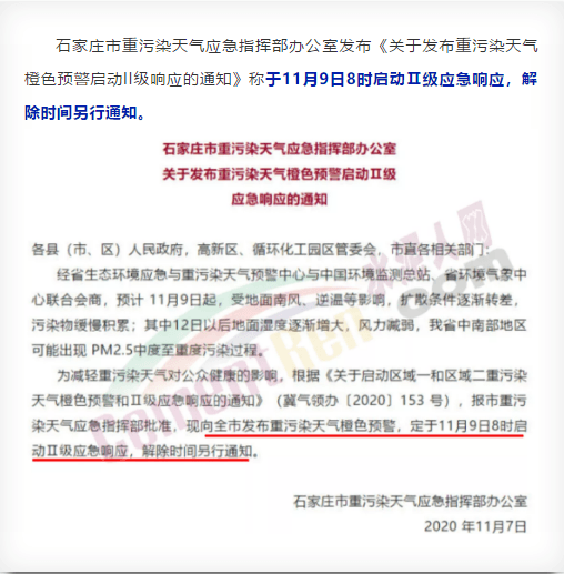 石家莊市11月9日8時(shí)啟動Ⅱ級應(yīng)急響應(yīng),解除時(shí)間另行通知
