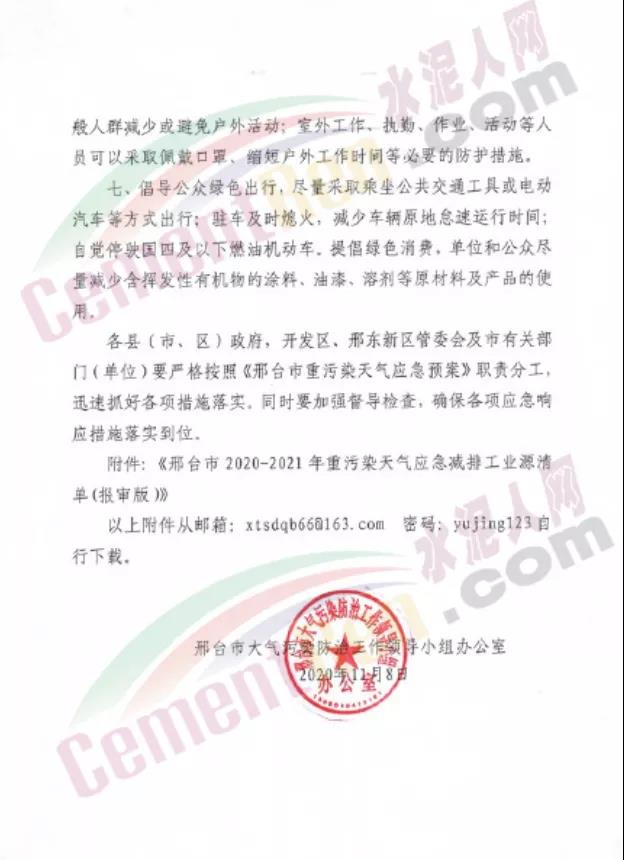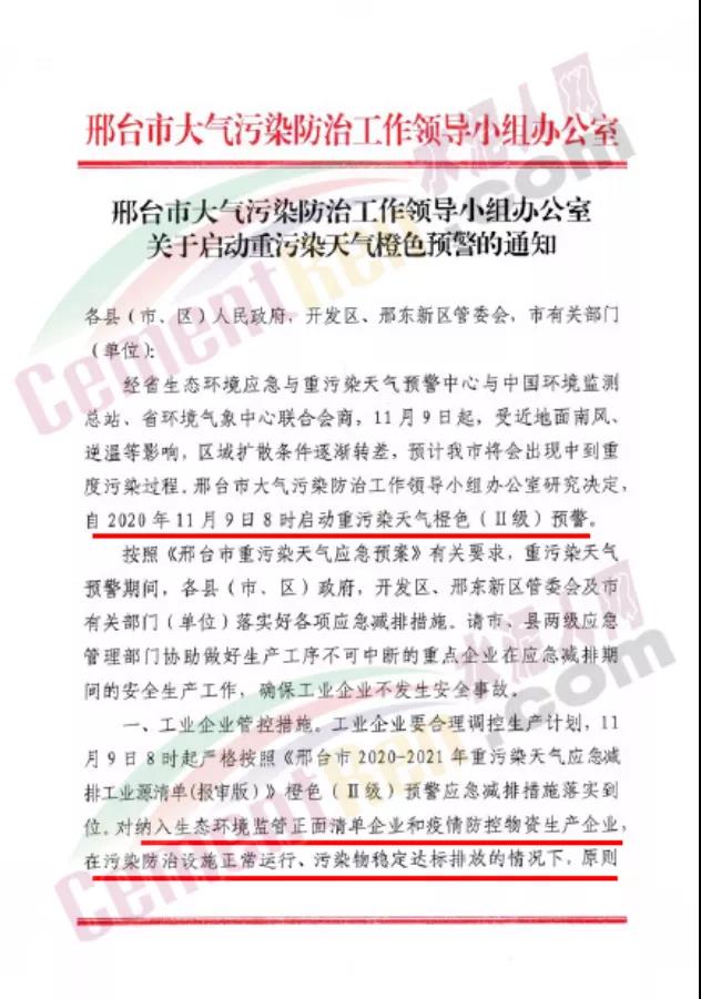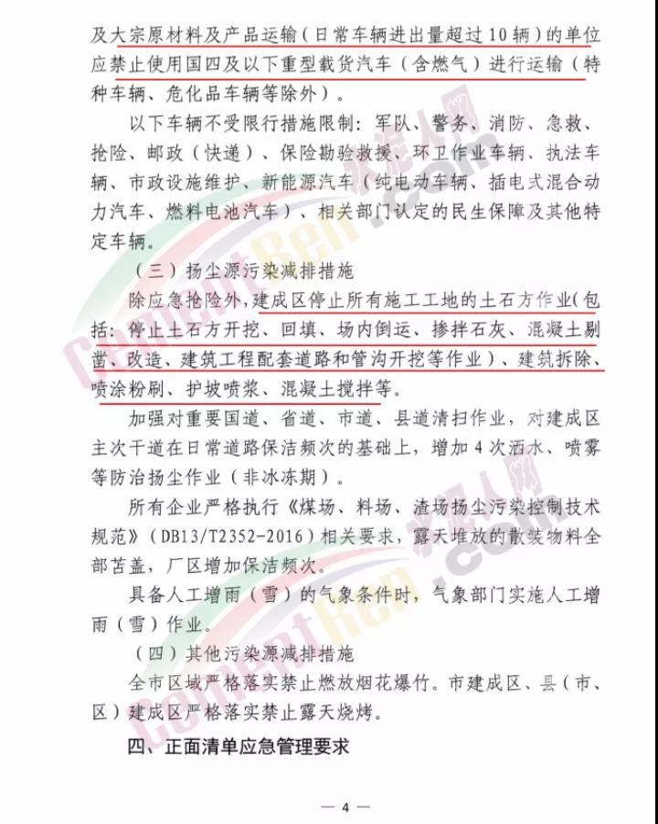 衡水市大氣污染防治工作領(lǐng)導(dǎo)小組辦公室發(fā)文:定于2020年11月9日8時(shí)啟動Ⅱ級應(yīng)急響應(yīng),解除時(shí)間另行通知。工業(yè)企業(yè)嚴(yán)格按照《2020-2021年衡水市工業(yè)企業(yè)應(yīng)急減排清單(報(bào)審版)》的清單中橙色預(yù)警減排措施執(zhí)行。除應(yīng)急搶險(xiǎn)外,建成區(qū)停止所有施工工地的土石方作業(yè)(包括:停止土石方開挖、回填、場內(nèi)倒運(yùn)、摻拌石灰、混凝土剔鑿、改造、建筑工程配套道路和管溝開挖等作業(yè))、建筑拆除、噴涂粉刷、護(hù)坡噴漿、混凝土攪拌等。
