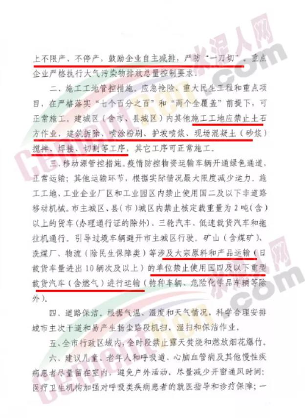 除應(yīng)急搶險(xiǎn)施工外,原則上,施工工地停止土石方、建筑拆除、噴涂粉刷等作業(yè)。礦山、砂石料廠、石材廠、石板廠等停止露天作業(yè)。