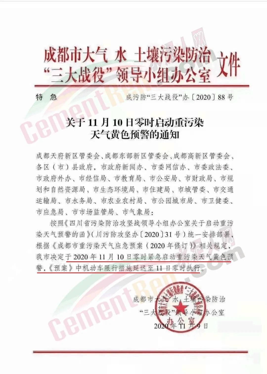 成都市大氣、水、土壤污染防治三大戰(zhàn)役"領(lǐng)導(dǎo)小組辦公室發(fā)布特急文件《關(guān)于11月10日零時(shí)啟動(dòng)重污染天氣黃色預(yù)警的通知》(成污防"三大戰(zhàn)役"辦〔2020〕88號(hào))稱,按照《四川省污染防治攻堅(jiān)戰(zhàn)領(lǐng)導(dǎo)小組辦公室關(guān)于啟動(dòng)重污染天氣預(yù)警的函》(川污防攻堅(jiān)辦〔2020〕31號(hào))統(tǒng)一安排部署,根據(jù)《成都市重污染天氣應(yīng)急預(yù)案(2020年修訂)》相關(guān)規(guī)定,成都市決定于2020年11月10日零時(shí)緊急啟動(dòng)重污染天氣黃色預(yù)警,《預(yù)案》中機(jī)動(dòng)車限行措施延遲至11日零時(shí)執(zhí)行。