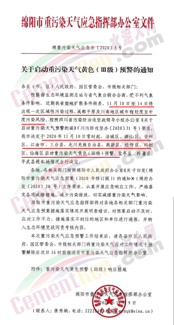 據(jù)水泥人網(wǎng)了解,綿陽市發(fā)布的《重污染天氣黃色預(yù)警(Ⅲ級)響應(yīng)措施》要求包括健康防護(hù)措施、倡議性污染減排措施和強(qiáng)制性污染減排措施。