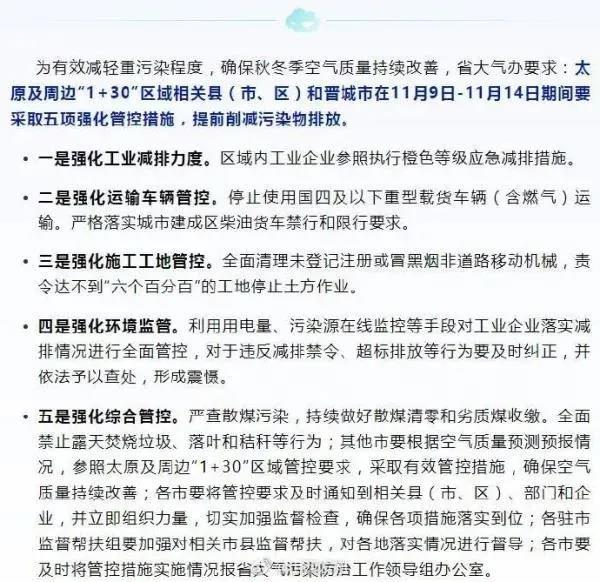 日前,山西省省大氣污染防治工作領(lǐng)導(dǎo)組辦公室印發(fā)《山西省大氣污染防治工作領(lǐng)導(dǎo)組辦公室關(guān)于做好近期不利氣象條件應(yīng)對的通知》指出,根據(jù)省生態(tài)環(huán)境監(jiān)測中心與中國環(huán)境監(jiān)測總站、省氣象部門會(huì)商預(yù)測,從11月9日開始,全省氣象條件轉(zhuǎn)差,全省大范圍以輕至中度污染為主,太原、陽泉、晉城、運(yùn)城、臨汾等部分城市短時(shí)可能達(dá)到重度污染。