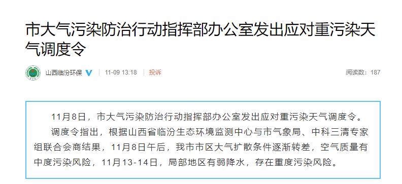 山西臨汾市大氣污染防治行動(dòng)指揮部辦公室發(fā)出應(yīng)對重污染天氣調(diào)度令。