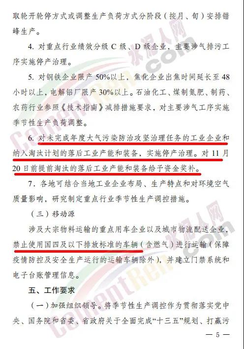 4.對(duì)未完成年度大氣污染防治攻堅(jiān)治理任務(wù)的工業(yè)企業(yè)和納入淘汰計(jì)劃的落后工業(yè)產(chǎn)能和裝備,實(shí)施停產(chǎn)治理。對(duì) 11 月20 日前提前淘汰的落后工業(yè)產(chǎn)能和裝備給予資金獎(jiǎng)補(bǔ)。