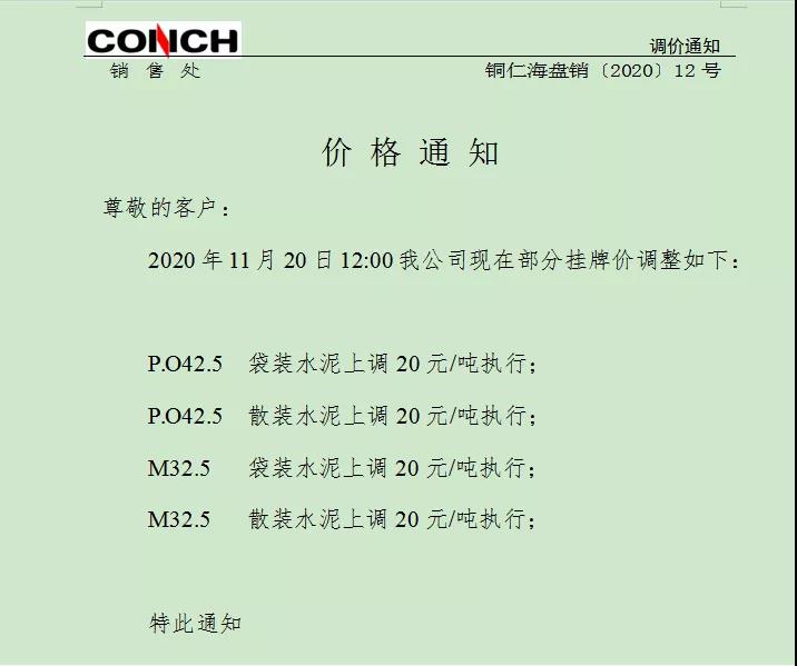 11月21日起重慶區(qū)域西南、海螺、東方希望等部分主要廠家對萬州、云陽等庫區(qū)一些市場高標水泥價格通知上調30元/噸。貴州銅仁海螺通知自20日12時起上調各標號水泥價格20元/噸。