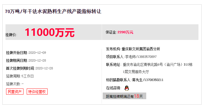 標(biāo)的系70萬噸/年干法水泥熟料生產(chǎn)線產(chǎn)能指標(biāo),擬按現(xiàn)狀以不低于轉(zhuǎn)讓底價11000萬元協(xié)議或競價整體轉(zhuǎn)讓,標(biāo)的基本情況如下: