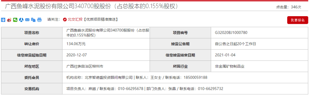 廣西魚峰水泥0.155%股份轉(zhuǎn)讓,底價為134.06萬元