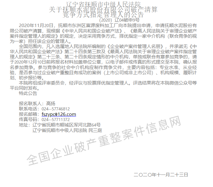 一、遼寧撫順?biāo)喙煞萦邢薰敬娈a(chǎn)清算競爭方式指定管理人