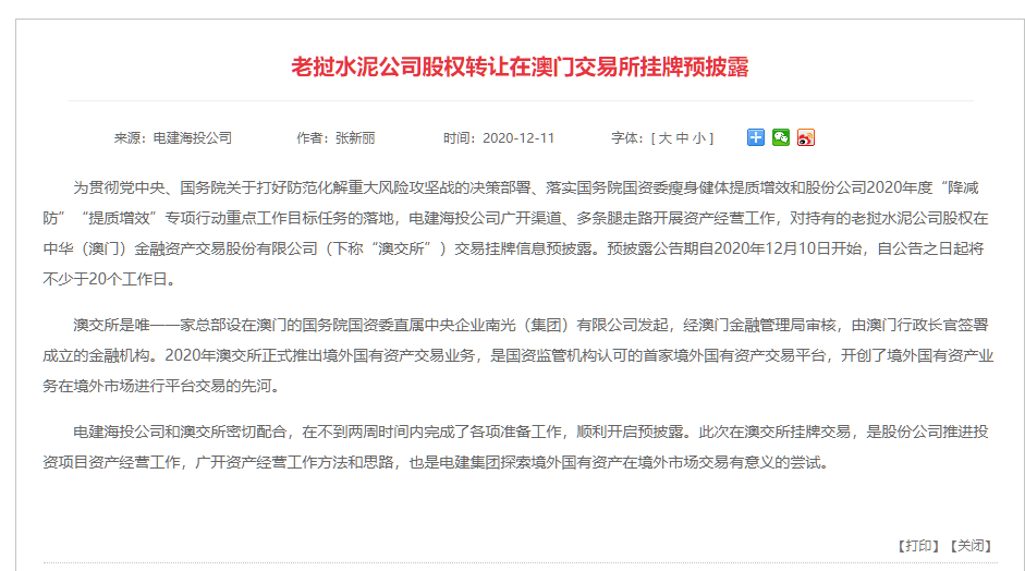 日前,中國電建官網(wǎng)發(fā)布消息稱,為防范化解重大風(fēng)險攻堅戰(zhàn)的決策部署、落實瘦身健體提質(zhì)增效和股份公司2020年度“降減防”“提質(zhì)增效”專項行動重點工作目標(biāo)任務(wù)的落地,電建海投公司廣開渠道、多條腿走路開展資產(chǎn)經(jīng)營工作,對持有的老撾水泥公司股權(quán)在中華(澳門)金融資產(chǎn)交易股份有限公司(下稱“澳交所”)交易掛牌信息預(yù)披露。預(yù)披露公告期自2020年12月10日開始,自公告之日起將不少于20個工作日。澳交所是唯一一家總部設(shè)在澳門的國務(wù)院國資委直屬中央企業(yè)南光(集團)有限公司發(fā)起,經(jīng)澳門金融管理局審核,由澳門行政長官簽署成立的金融機構(gòu)。2020年澳交所正式推出境外國有資產(chǎn)交易業(yè)務(wù),是國資監(jiān)管機構(gòu)認可的首家境外國有資產(chǎn)交易平臺,開創(chuàng)了境外國有資產(chǎn)業(yè)務(wù)在境外市場進行平臺交易的先河。
