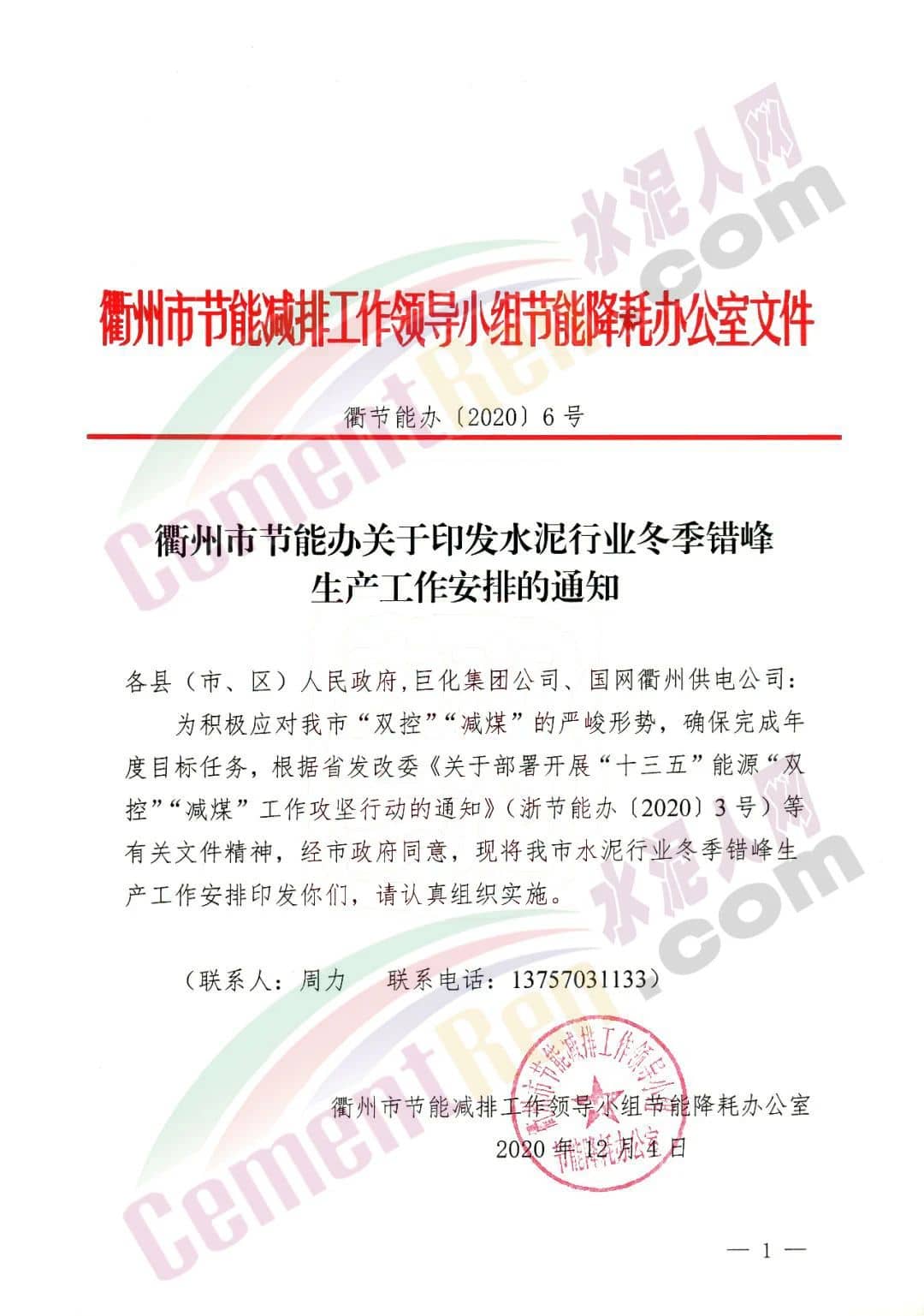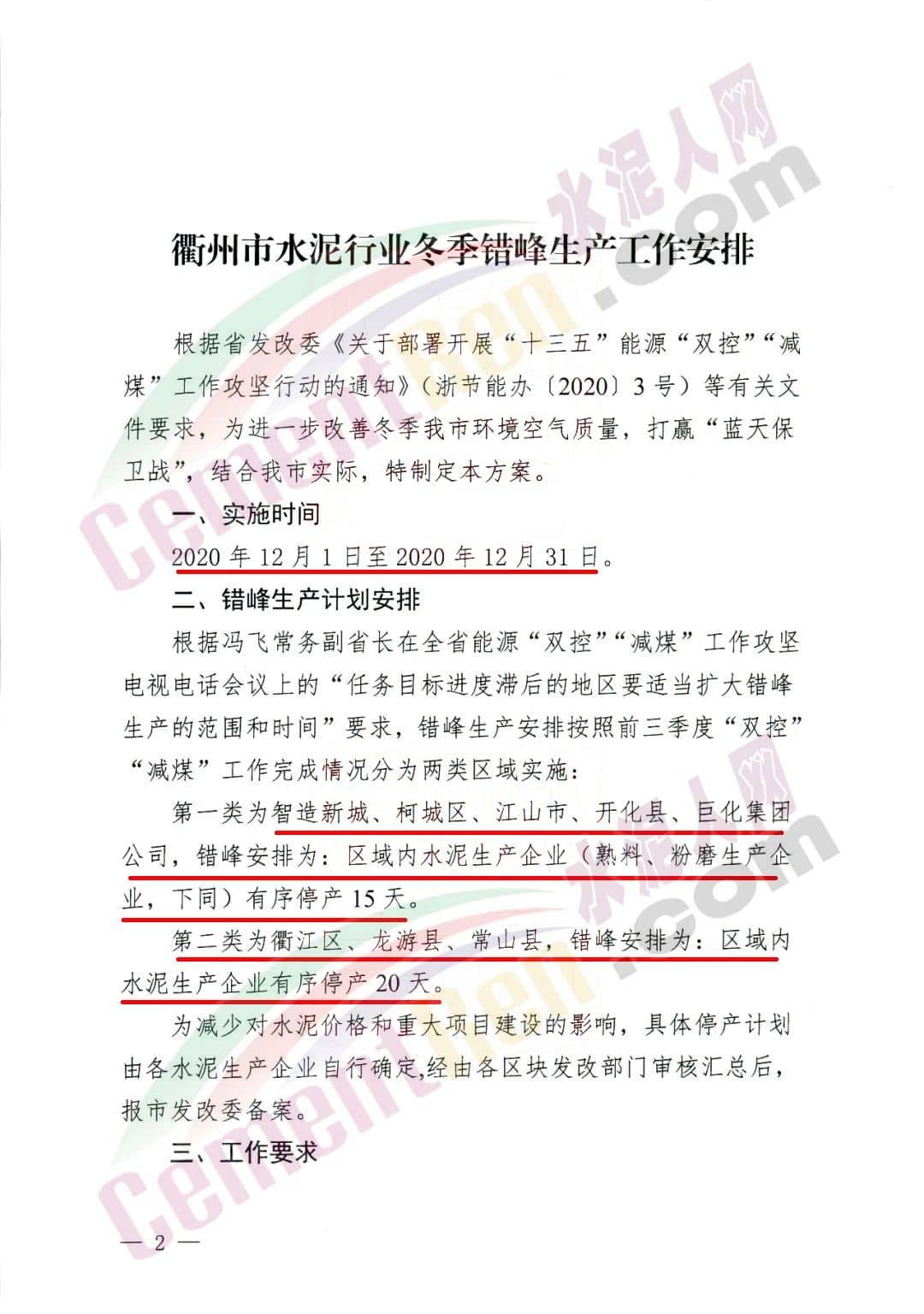 日前,浙江省衢州市節(jié)能喊排工作領導小組節(jié)能降耗辦公室發(fā)布《衢州市水泥行業(yè)冬季錯峰生產(chǎn)工作安排》,要求在2020年12月31日前,水泥生產(chǎn)企業(yè)實施錯峰生產(chǎn)。第一類為智造新城、柯城區(qū)、江山市、開化縣、巨化集團公司,錯峰安排為,區(qū)域內(nèi)水泥生產(chǎn)企業(yè)包括熟料和粉磨生產(chǎn)企業(yè)有序停產(chǎn)15天。第二類為衢江區(qū)、龍游縣、常山縣,錯峰安排為,區(qū)域內(nèi)水泥生產(chǎn)企業(yè)包括熟料和粉磨生產(chǎn)企業(yè)有序停產(chǎn)20天。通知原文如下: