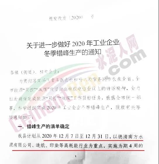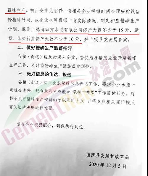 同期,浙江省湖州市德清縣也發(fā)布了錯峰生產(chǎn)通知。要求從2020年12月7日至12月31日,以德清南方水泥有限公司、造紙、印染等高耗能行業(yè)為重點,實施為期4周的錯峰生產(chǎn)。其中提到,原則上德清南方水泥有限公司停產(chǎn)天數(shù)不少于15天,造紙、印染行業(yè)停產(chǎn)天數(shù)不少于10天,并上報縣發(fā)改局備案。