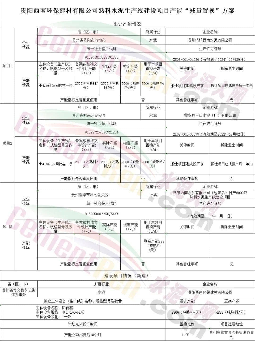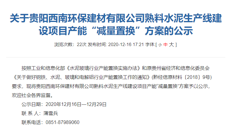 日前, 貴陽市工業(yè)和信息化廳發(fā)布了 貴陽西南環(huán)保建材有限公司日產(chǎn)3866噸熟料水泥生產(chǎn)線項目產(chǎn)能置換方案公示。公示文件顯示,新建生產(chǎn)線產(chǎn)能指標(biāo)分別來自貴州清鎮(zhèn)西南水泥有限公司、甕安縣玉山水泥(廠)有限公司和畢節(jié)西南水泥有限公司3家企業(yè),新建生產(chǎn)線將于產(chǎn)能立項批復(fù)后18個月。