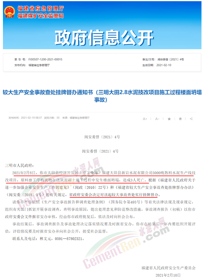 據(jù)水泥人網(wǎng)了解,福建省應(yīng)急管理廳發(fā)布較大生產(chǎn)安全事故查處掛牌督辦通知書(三明大田2.8水泥技改項(xiàng)目施工過程樓面坍塌事故)稱,2021年2月8日,三明市大田縣經(jīng)濟(jì)開發(fā)區(qū)上京工業(yè)園,福建大田縣新巖水泥有限公司5000噸熟料水泥生產(chǎn)線技改項(xiàng)目,原料磨工序構(gòu)筑物在澆筑混凝土施工過程中發(fā)生樓面坍塌,造成3人死亡。 依據(jù)有關(guān)規(guī)定,福建省政府安委會(huì)決定對(duì)該起較大事故查處實(shí)行掛牌督辦。