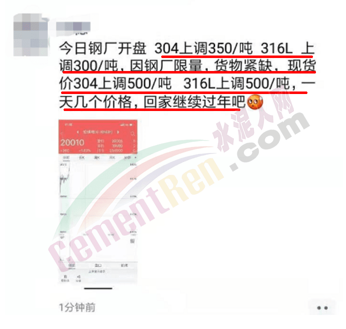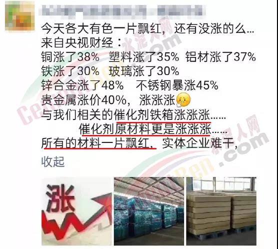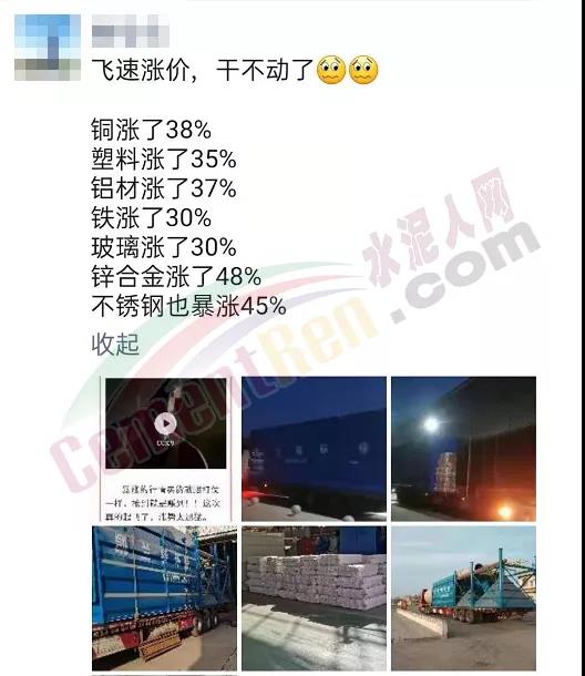近日,水泥行業(yè)的上游供應商“炸鍋了”,設備供應商“漲價函”滿天飛,只因為:銅漲了38%、塑料漲了35%、鋁材漲了37%、鐵漲了30%、玻璃漲了30%、鋅合金漲了48%、不銹鋼也暴漲45%。