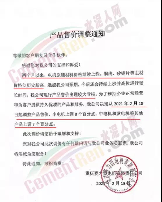 重慶賽力盟電機有限責任公司通知,兩個月以來,電機原輔材料價格繼續(xù)上漲,銅線、矽鋼片等主材價格創(chuàng)歷史新高,遠超公司預期,今后還會持續(xù)上漲并高位運行較長時間,公司現行產品售價出現較大虧損。為了維持企業(yè)正常經營和為客戶提供持久優(yōu)質的產品和服務,決定從2021年2月18日起調整產品售價,小電機上調8個百分點、中電機和發(fā)電機等其他產品上調7個百分點。