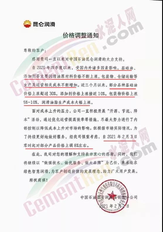 中國石油昆侖潤滑通知,自2020年四季度以來,受國內外諸多因素影響,基礎油、添加劑等主要潤滑油原材料價格不斷上漲,包裝物、倉儲運輸等生產及運營相關成本不斷增加。近三個月以來,部分品種基礎油價格上漲超過30%,添加劑價格上漲接近10%,包裝物價格上漲5%-10%,潤滑油脂生產成本大幅上漲。經公司慎重考慮,自2021年2月3日零時起對部分產品價格上調8%左右。
