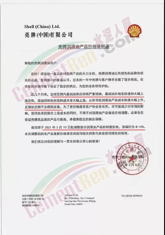 殼牌潤滑油發(fā)產品價格說明函稱,近幾個月來,全球范圍內基礎油供應持續(xù)嚴重短缺,基礎油價格呈快速和大幅上漲態(tài)勢,添加劑和包材采購成本亦大幅上漲,從而導致潤滑油產品成本快速大幅上升,且預估近期不會得到改善。為了更好地服務客戶和業(yè)務伙伴,盡可能減少對市場的影響,公司在承擔部分上漲成本的同時,不得不對潤滑油產品做出價格調整。此舉旨在保證殼牌高品質的產品與服務,并提供穩(wěn)定的供應保障,公司將于2021年3月10日起調整部分潤滑油產品的銷售價格,漲幅約為8-10%。
