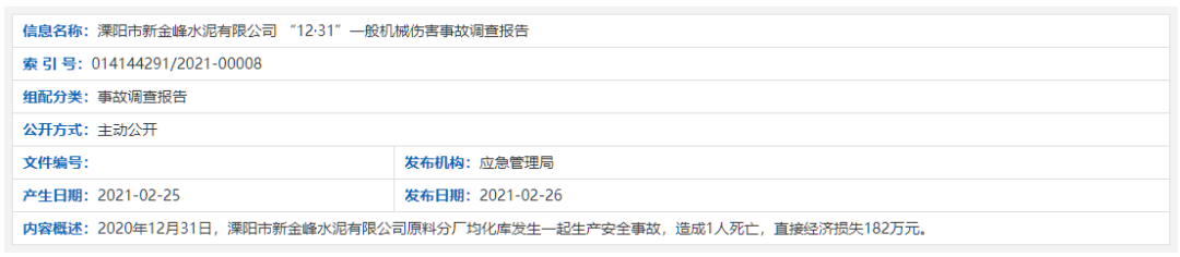 日前,溧陽市人民政府官方網(wǎng)站發(fā)布了 《溧陽市新金峰水泥有限公司 “12·31”一般機械傷害事故調(diào)查報告》稱,2020年12月31日,溧陽市新金峰水泥有限公司原料分廠均化庫發(fā)生一起生產(chǎn)安全事故,造成1人死亡,直接經(jīng)濟損失182萬元。死亡人員為新金峰公司原料分廠均化庫堆取料機崗位工。