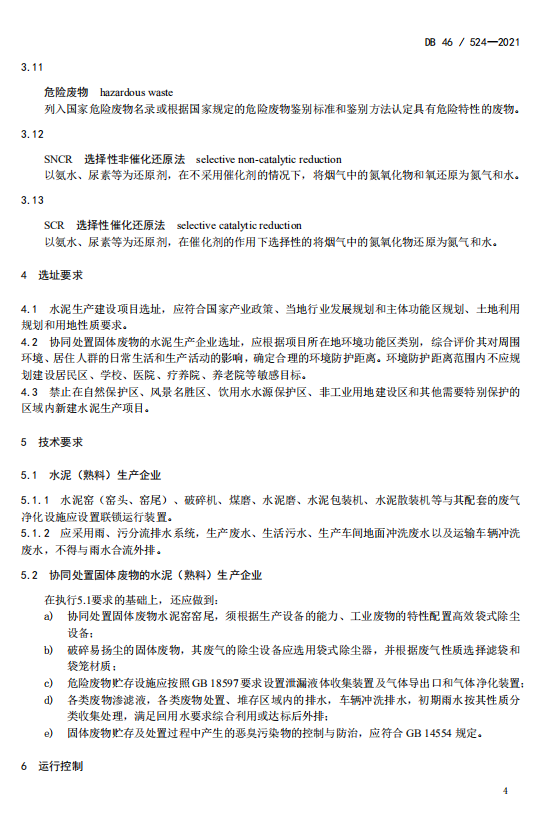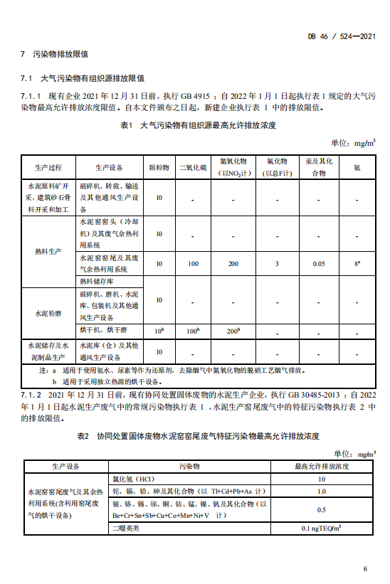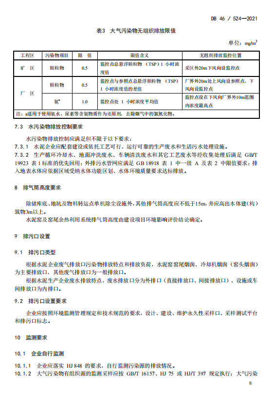 此次出臺的《標準》是以國家《水泥工業(yè)大氣污染物排放標準》(GB4915-2013)為基礎,制定嚴于當前國家標準特別排放限值的指標限值,在技術可達、經(jīng)濟可行的前提下,對污染物排放實施從嚴管控。其中有組織排放的顆粒物、二氧化硫和氮氧化物濃度限值分別為10、100、200毫克每立方米;無組織排放的顆粒物、氨濃度限值分別為0.5、1.0毫克每立方米;