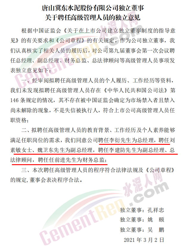3月2日晚間唐山冀東水泥上市公司連發(fā)五條公告,內(nèi)容為董事長(zhǎng)、總經(jīng)理、監(jiān)事會(huì)主席,以及其他高級(jí)管理人員的選舉及任命。