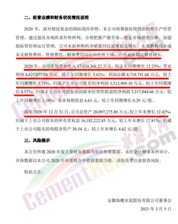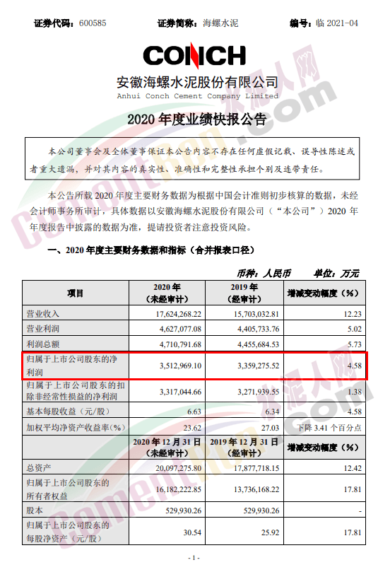 海螺水泥凈利潤(rùn)351.30億元!同比增加4.58%!