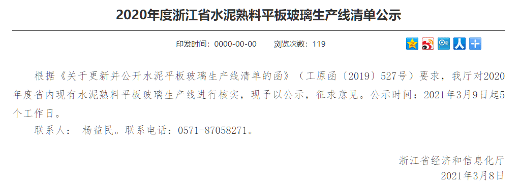 2020年度浙江省水泥熟料平板玻璃生產(chǎn)清單公示》。公示時間為2021年3月9日起5個工作日。