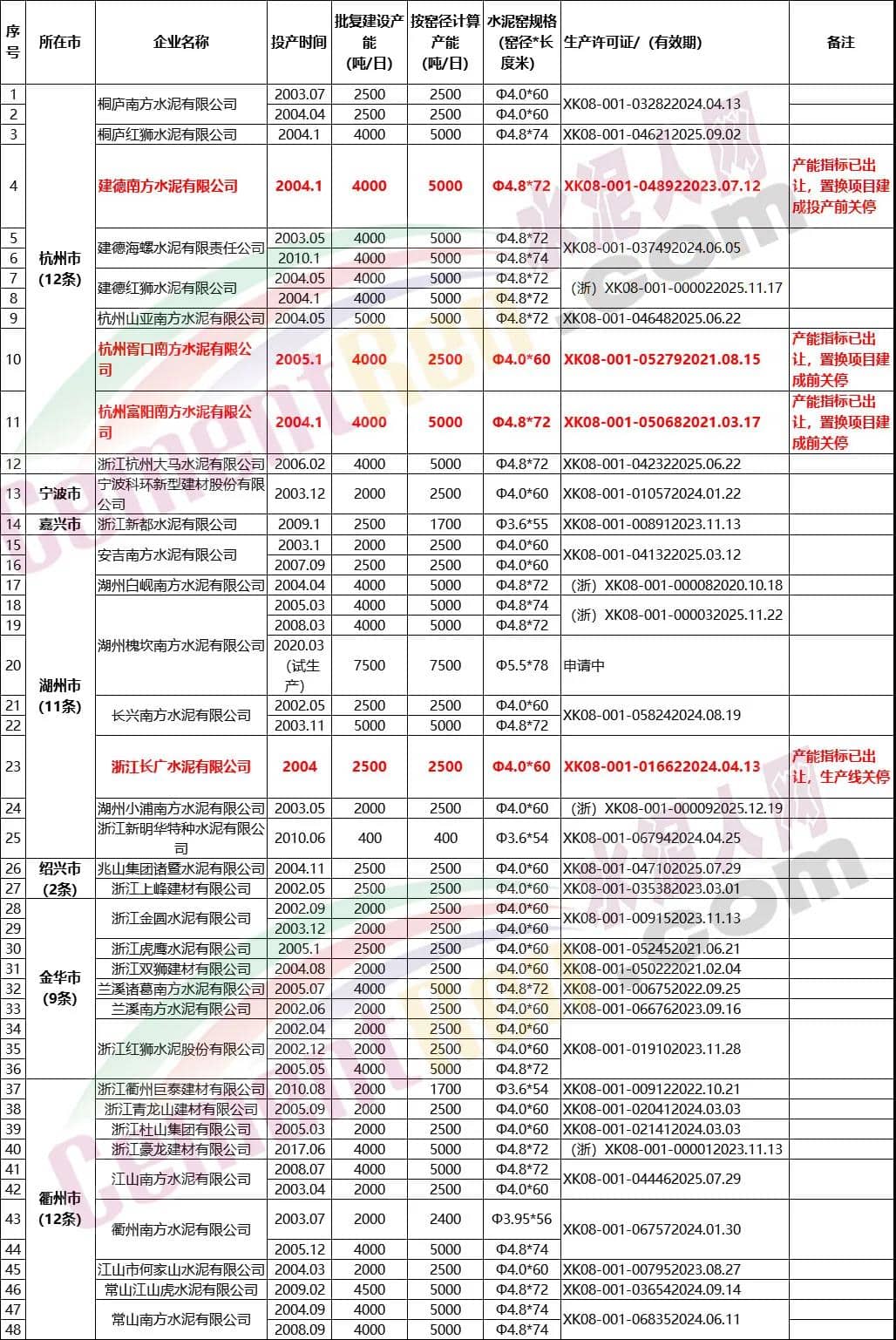 浙江省內(nèi)共有35家水泥企業(yè),48條水泥熟料生產(chǎn)線,批復(fù)建設(shè)產(chǎn)能合計4527萬噸/年,按窯徑計算產(chǎn)能合計5211萬噸/年。其中4條生產(chǎn)線450萬噸/年產(chǎn)能指標(biāo)已明確出讓。