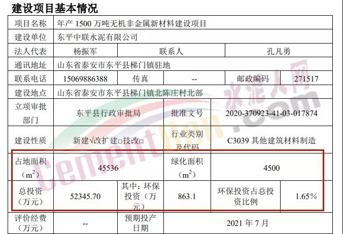 據(jù)水泥人網(wǎng)了解,東平中聯(lián)水泥有限公司無(wú)機(jī)非金屬新材料建設(shè)項(xiàng)目位于山東省泰安市東平縣梯門鎮(zhèn)北陳莊村北部,總投資 52345.70 萬(wàn)元,其中環(huán)保投資 863.1 萬(wàn)元,占總投資比例的1.65%,項(xiàng)目占地面積 45536平方米,綠化面積4500平方米。預(yù)計(jì)投產(chǎn)日期為2021年7月。