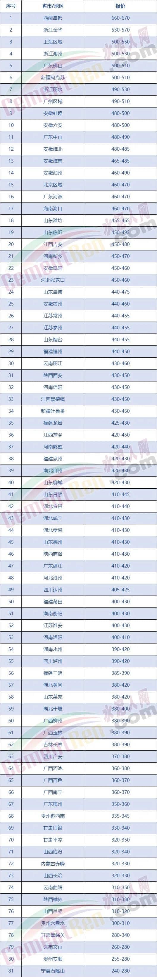 全國主要城市P.O42.5散裝水泥價格