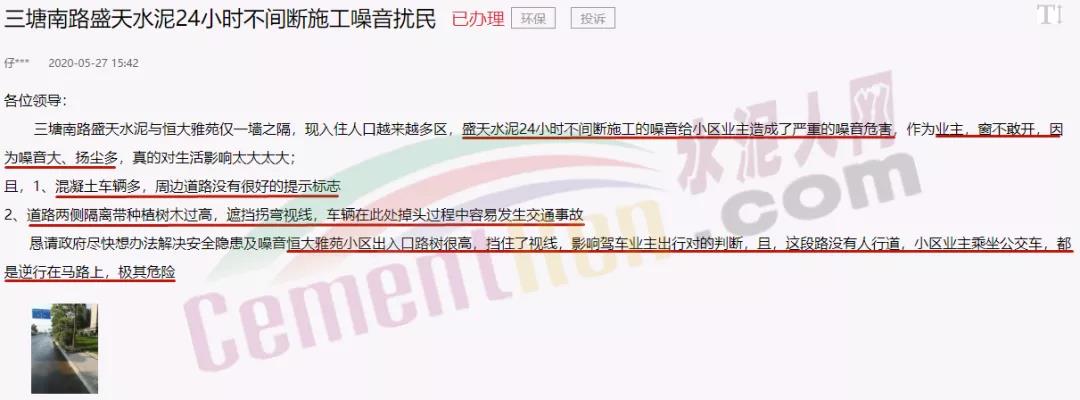 據(jù)水泥人網(wǎng)了解,上述兩家企業(yè)一家為水泥制品工廠,一家為商品混凝生產(chǎn)企業(yè)。且早在2020年5月27日,就有網(wǎng)友在人民網(wǎng)地方留言板給興寧區(qū)委書(shū)記留言稱,三塘南路盛天水泥24小時(shí)不間斷施工,噪音大、揚(yáng)塵多,業(yè)主不敢開(kāi)窗。而且,混凝土車(chē)輛多,周邊道路沒(méi)有很好的提示標(biāo)志 ,道路兩側(cè)隔離帶種植樹(shù)木遮擋拐彎視線,車(chē)輛在此處極容易發(fā)生交通事故。