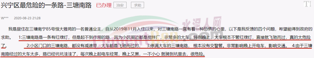 但是,2020年8月23日,又有網(wǎng)友在人民網(wǎng)地方留言板留言稱,三塘南路是興寧區(qū)最危險(xiǎn)的一條路,紅綠燈起不到作用,沒(méi)有減速帶,沒(méi)有交警管,周邊攪拌廠的大車(chē)都是直接就飛馳而過(guò),非常危險(xiǎn)。而且由于三塘南路經(jīng)過(guò)的大車(chē)太多,路坑坑洼洼,晚上又黑,一不小心就騎到坑里去,很危險(xiǎn)。