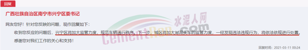 2021年3月11日廣西壯族自治區(qū)南寧市興寧區(qū)委書(shū)記回應(yīng)稱興寧區(qū)將加大監(jiān)管力度,規(guī)范車(chē)輛通行秩序。下一步,城區(qū)將加大對(duì)泥頭車(chē)的監(jiān)管力度,一經(jīng)發(fā)現(xiàn)違法違規(guī)行為,將依法依規(guī)進(jìn)行處置。