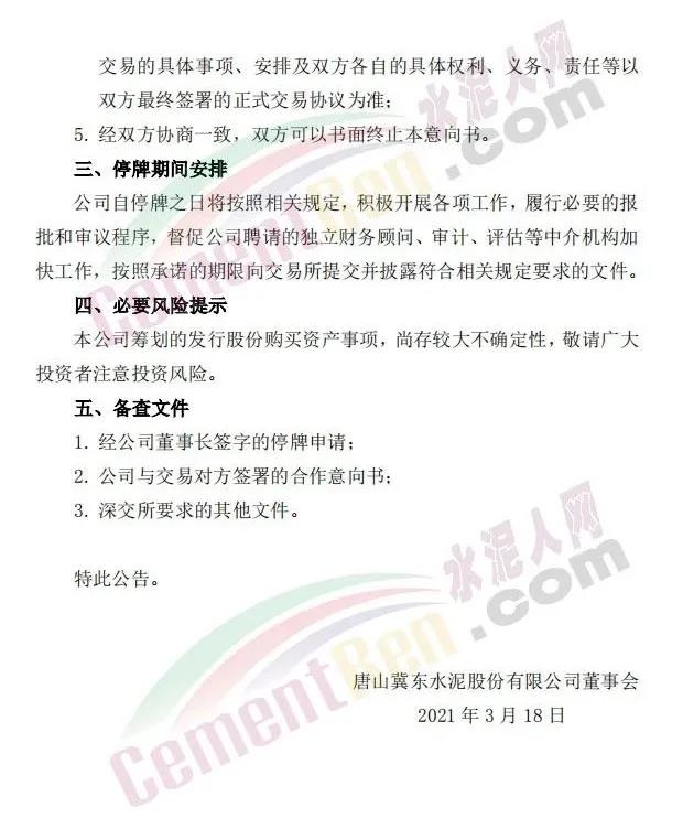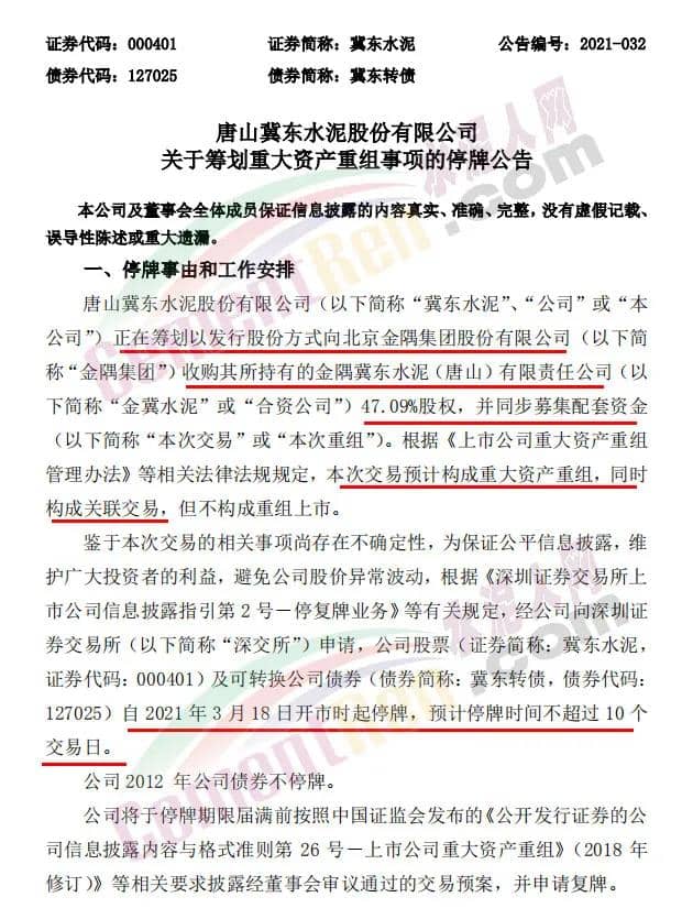 冀東水泥(000401)3月17日晚間公告,公司正在籌劃以發(fā)行股份方式向北京金隅集團(tuán)股份有限公司收購(gòu)其所持有的金隅冀東水泥(唐山)有限責(zé)任公司47.09%股權(quán),并同步募集配套資金。
