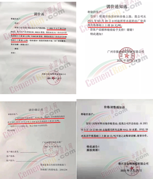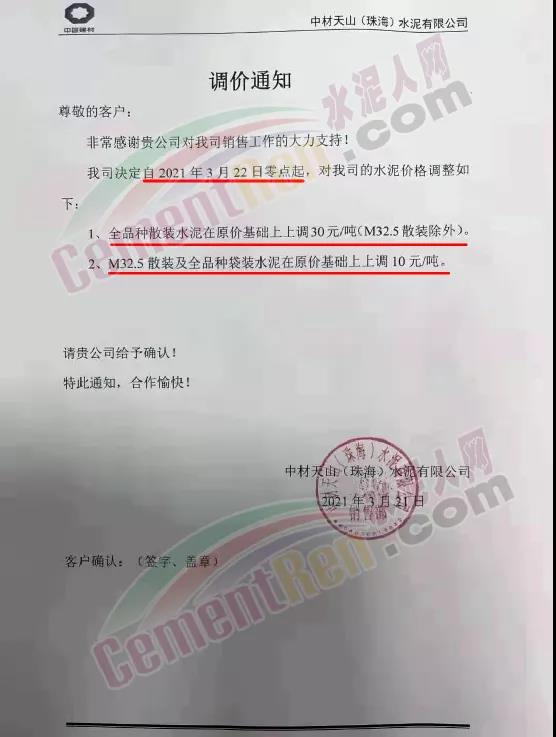 惠州市光大水泥通知,根據(jù)市場(chǎng)實(shí)際情況,經(jīng)公司決定,從2021年03月23日零時(shí)起,公司銷(xiāo)往東莞區(qū)域、廣州區(qū)域、惠州區(qū)域及深圳區(qū)域的 PII52.5R散裝水泥在原有價(jià)格的基礎(chǔ)上上調(diào)35元/噸,PO42.5R散裝水泥和PO42.5散裝水泥在原有價(jià)格的基礎(chǔ)上上調(diào)30元/噸,PO42.5R包裝水泥、PC42.5 散包裝水泥、PP32.5R包裝水泥和M32.5包裝水泥在原有價(jià)格的基礎(chǔ)上上調(diào)10元/噸;其他條款按原合同執(zhí)行。