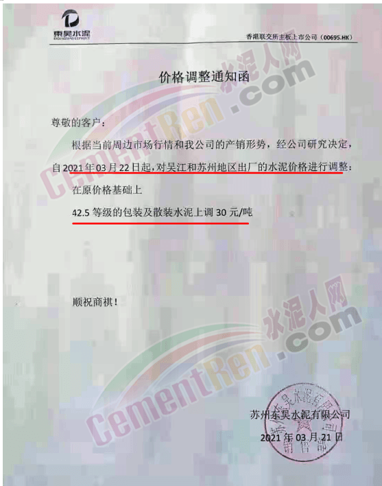 蘇州東吳水泥通知,3月22日起對(duì)吳江和蘇州地區(qū)出廠(chǎng)的水泥價(jià)格進(jìn)行調(diào)整,42.5等級(jí)包裝及散裝水泥統(tǒng)一上調(diào)30元/噸。