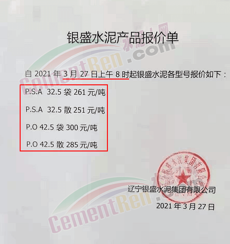 日前,遼寧銀盛水泥通知,自27日起執(zhí)行最新產(chǎn)品報(bào)價(jià),其中PO42.5散裝水泥報(bào)價(jià)285元/噸。