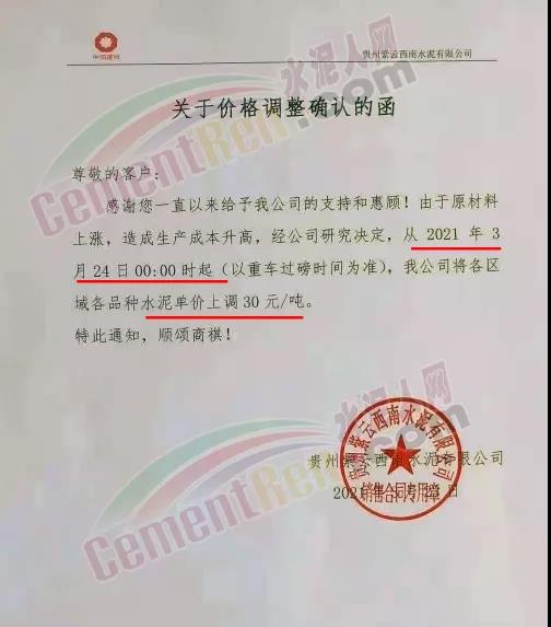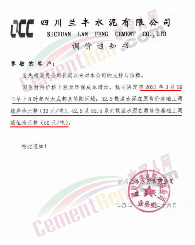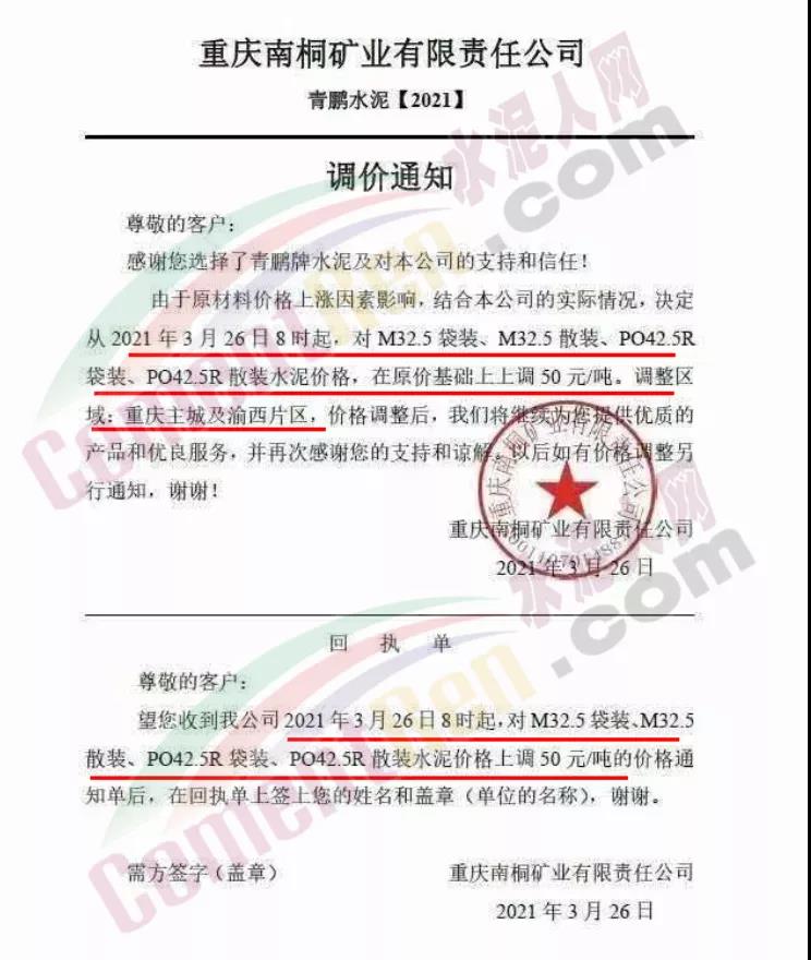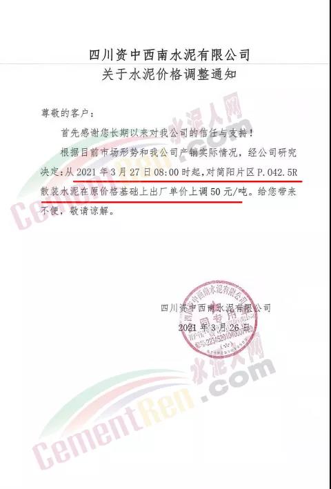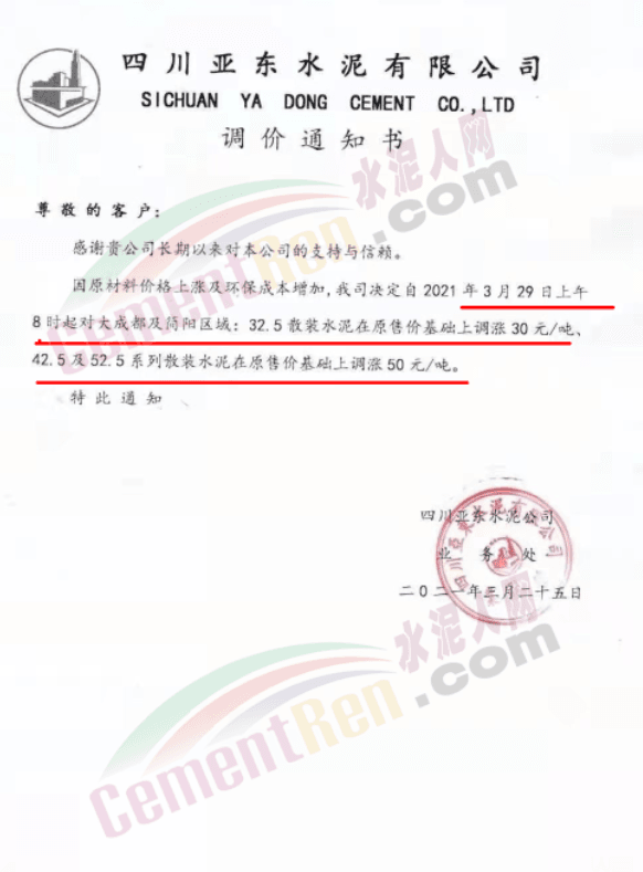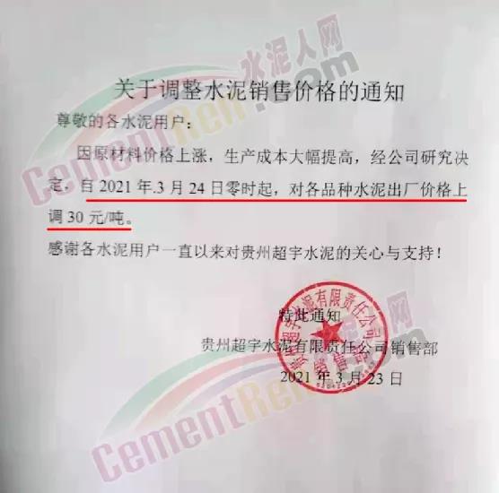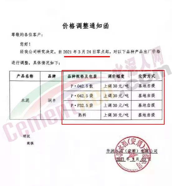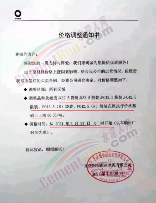 根據(jù)近期市場(chǎng)形勢(shì),我司決定于2021年3月25日00:00起,全品項(xiàng)袋裝和散裝水泥價(jià)格上調(diào)20元/噸。