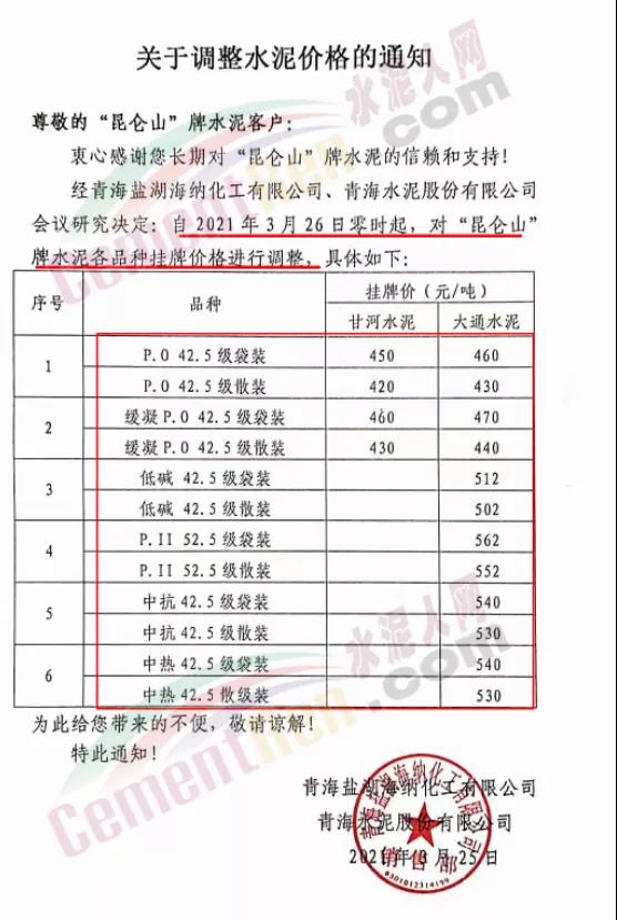 青海鹽湖海納化工有限公司青海水泥股份有限公司通知自3月26日零時(shí)起,對(duì)“昆侖山”牌水泥各品種掛牌價(jià)格進(jìn)行調(diào)整,調(diào)整后PO42.5散裝水泥甘河水泥報(bào)價(jià)420元/噸,大通水泥報(bào)價(jià)430元/噸。