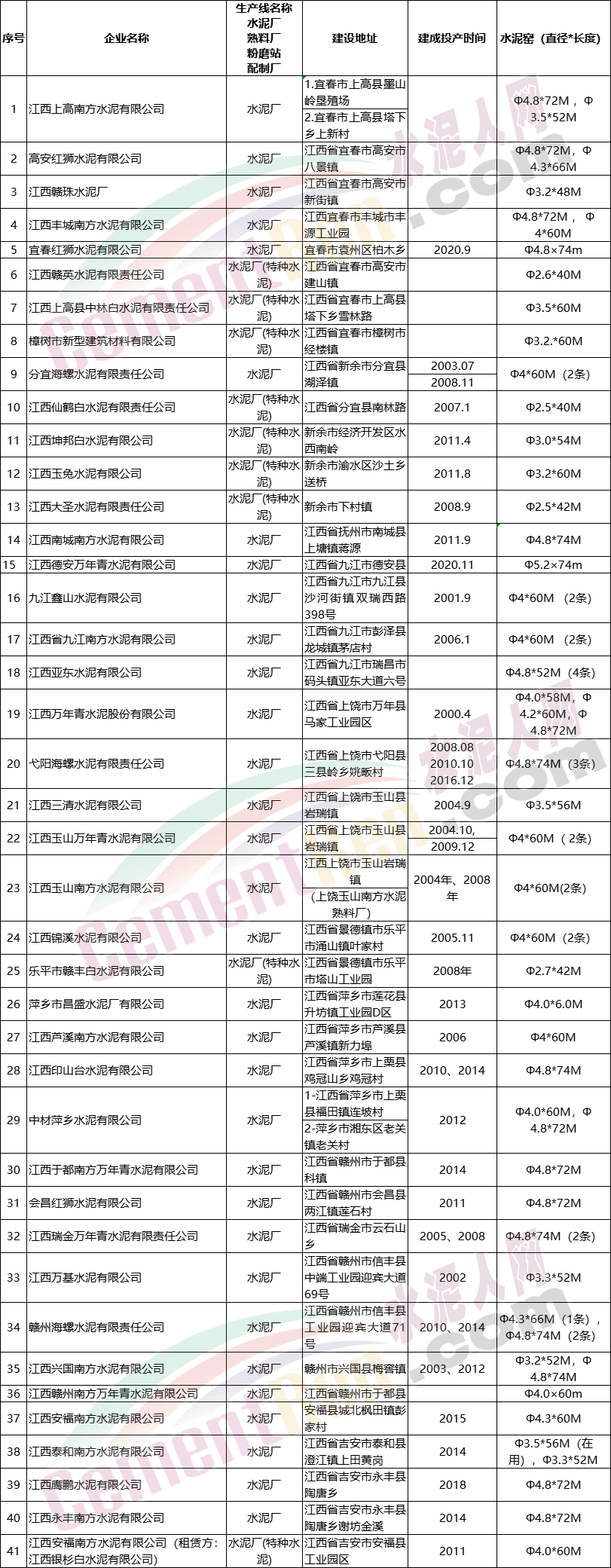 日前江西省工信廳發(fā)布截止到2020年末的水泥熟料產(chǎn)能清單,共41家全能水泥企業(yè),包括九家特種水泥生產(chǎn)企業(yè)和南方水泥、紅獅水泥、萬年青水泥、亞東水泥、海螺水泥、中材水泥等水泥集團企業(yè)下屬全能水泥廠。其中,宜春紅獅水泥和江西德安萬年青水泥有限公司熟料生產(chǎn)線項目是在2020年內(nèi)建成的。 江西省水泥熟料生產(chǎn)線情況表