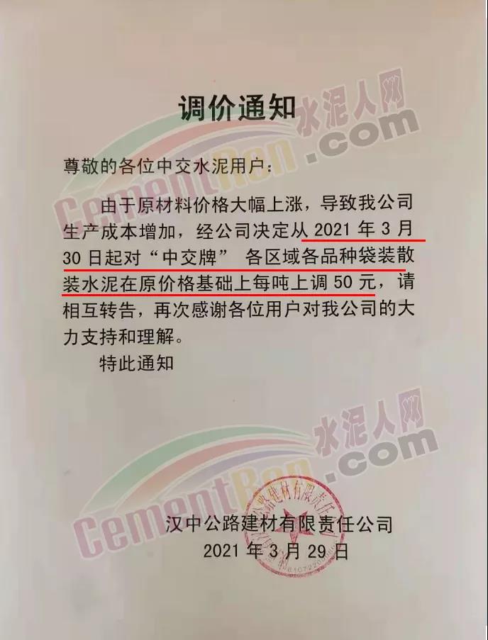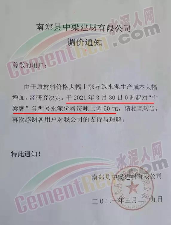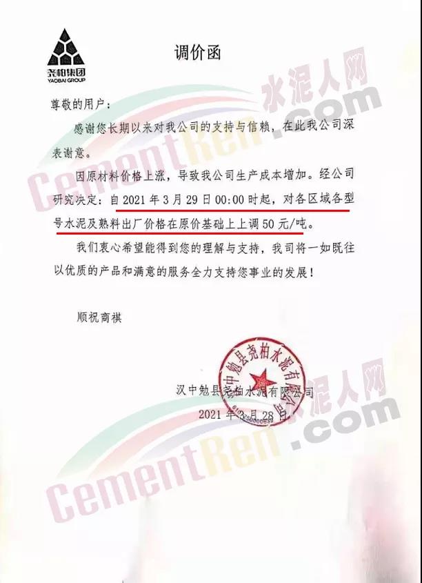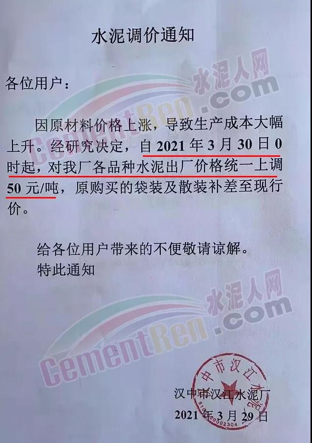 漢中堯柏水泥、漢中勉縣堯柏水泥、中材漢江水泥、漢中市漢江水泥廠、南郊縣中梁建材有限公司、漢中公路建材有限責(zé)任公司等多家品牌水泥企業(yè)通知,自29日起上調(diào)各標(biāo)號水泥及熟料出廠價格50元/噸。