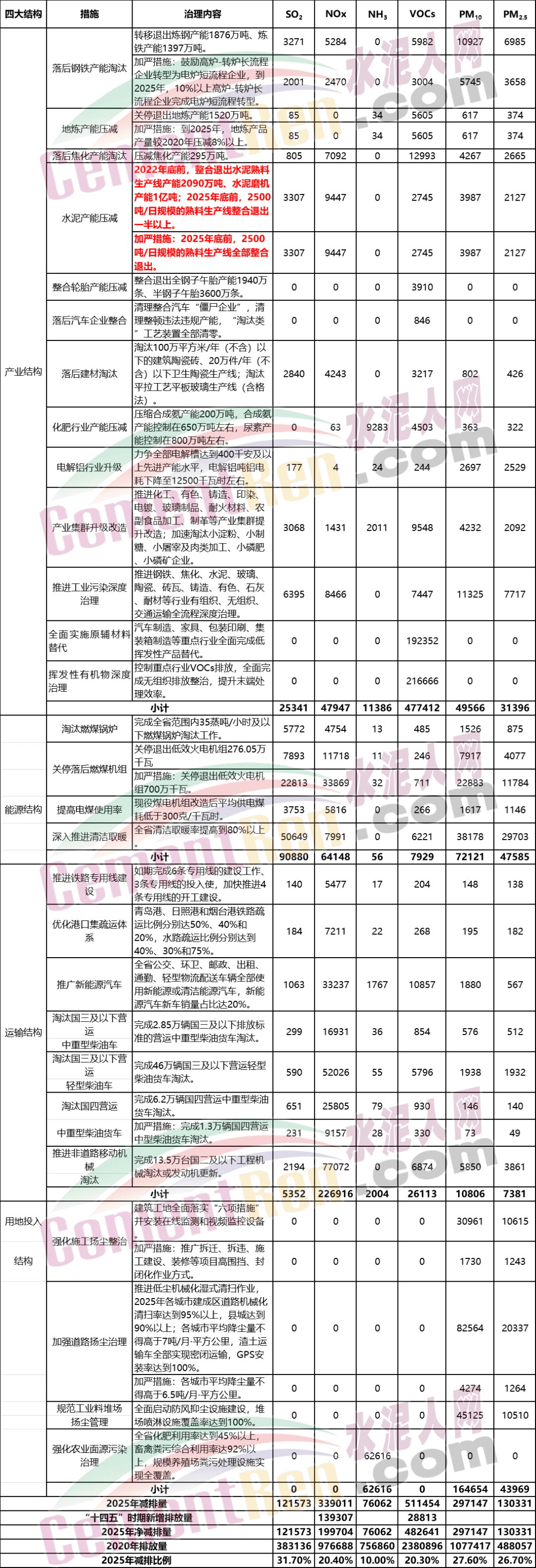 據(jù)水泥人網(wǎng)了解,近日,山東省生態(tài)環(huán)境廳發(fā)布《全省“十四五”和2021年空氣質(zhì)量改善目標(biāo)及重點(diǎn)任務(wù)》,明確指出2022年底前,整合退出水泥熟料生產(chǎn)線產(chǎn)能2090萬噸、水泥磨機(jī)產(chǎn)能1億噸;2500噸/日規(guī)模的熟料生產(chǎn)線整合退出一半以上。2025年底前,2500t/d規(guī)模的熟料生產(chǎn)線全部整合退出。全文如下: