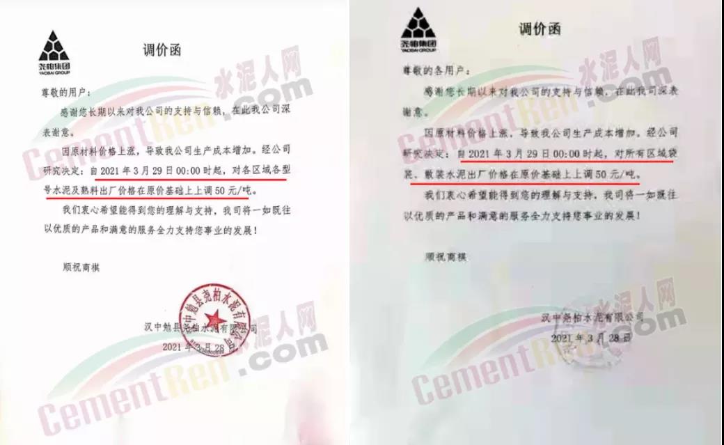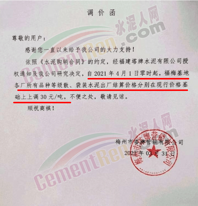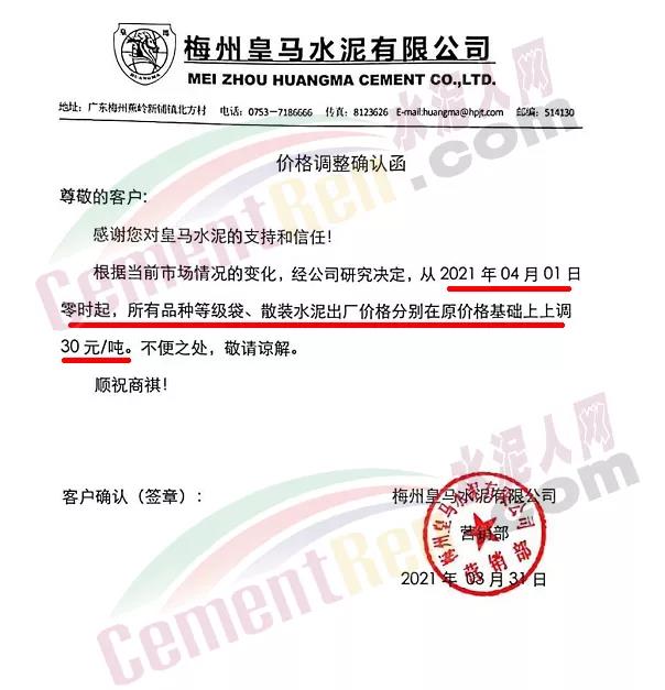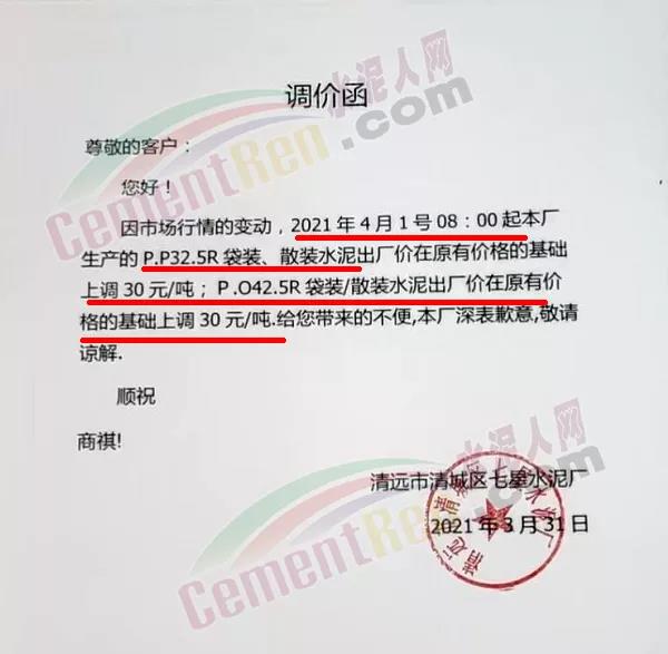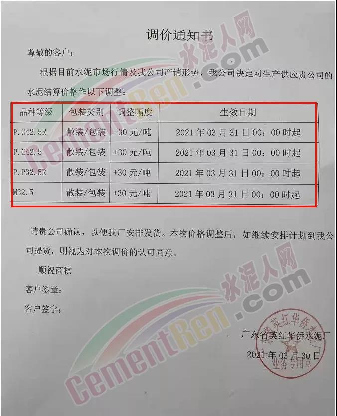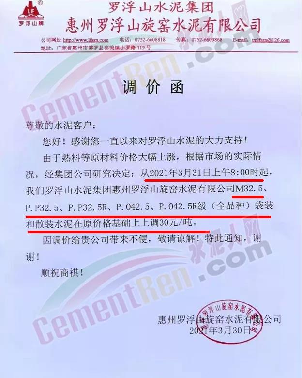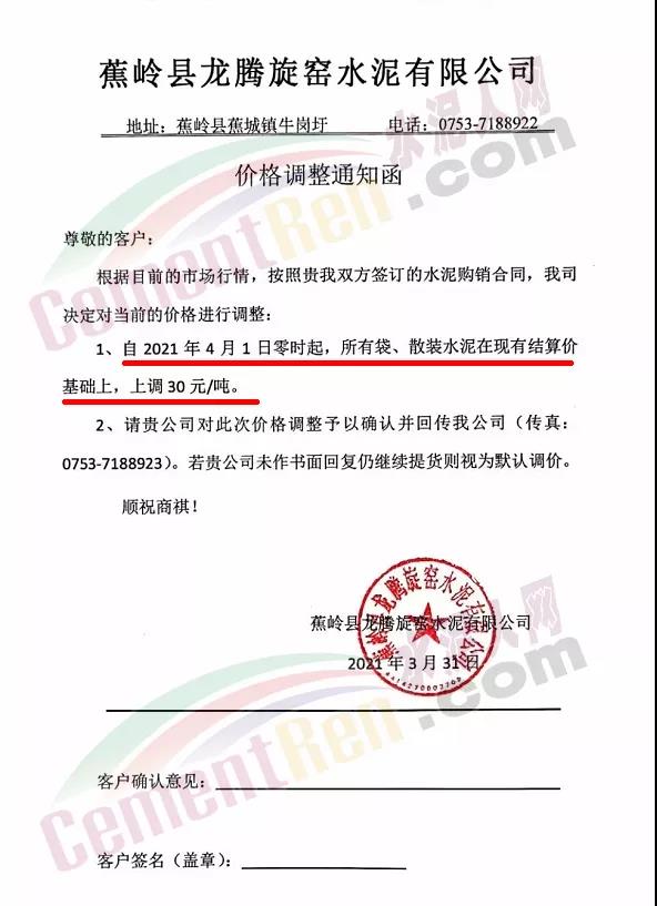由于原燃材料大幅度上漲,經(jīng)我司研究決定,從2021年04月1日起,我司發(fā)往廣東省的各品牌、各品種規(guī)格袋裝、散裝水泥出廠單價(jià)在原價(jià)格基礎(chǔ)上每噸上調(diào)30元。熟料出廠單價(jià)在原價(jià)格基礎(chǔ)上每噸上調(diào)20元。不便之處,敬請(qǐng)見(jiàn)諒。