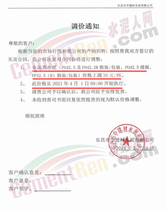感謝您長(zhǎng)期以來(lái)對(duì)我公司產(chǎn)品的信任和支持。因生產(chǎn)成本增加,庫(kù)存緊張,經(jīng)我公司研究決定:為了確保持續(xù)向客戶保質(zhì)保量提供優(yōu)質(zhì)產(chǎn)品,自2021年3月31日早8點(diǎn)開始對(duì)我公司產(chǎn)品價(jià)格做出如下調(diào)整:P.O42.5等級(jí)水泥產(chǎn)品在原價(jià)基礎(chǔ)上上調(diào)30元/噸。我公司將以微信或短信形式發(fā)送調(diào)價(jià)通知,如貴公司繼續(xù)提貨則視為同意接受新價(jià)格。