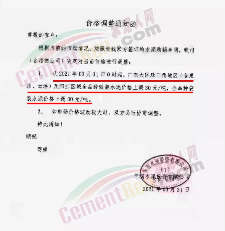 華潤(rùn)水泥投資有限公司通知,自3月31日0時(shí)起,廣東珠三角地區(qū)(含惠州、云?。┘瓣?yáng)江全區(qū)域全品種袋裝和散裝水泥價(jià)格上調(diào)30元/噸。