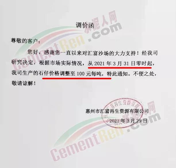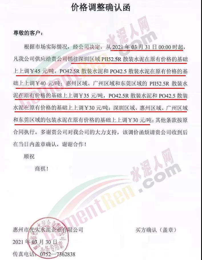 惠州市光大水泥企業(yè)有限公司通知從2021年3月31日零時(shí)起: